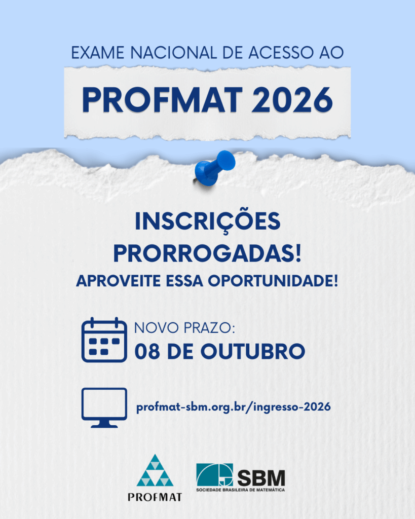 Uma nova chance para você conquistar sua vaga no PROFMAT 2026! As inscrições para o Exame Nacional de Acesso foram prorrogadas até 8 de outubro de 2025. Aproveite para